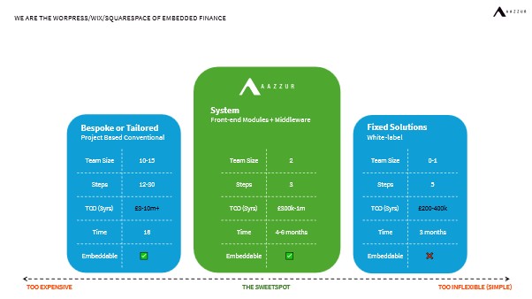 Ultimately, partnering with a fintech simplifies the process. The diagram below shows how fintech AAZZUR provides the connectivity and experience layer. It’s worth noting that you will need to add 2-3 years if you also want to do all of your own licenses and connection to the payment rails, a timeframe most businesses cannot afford.